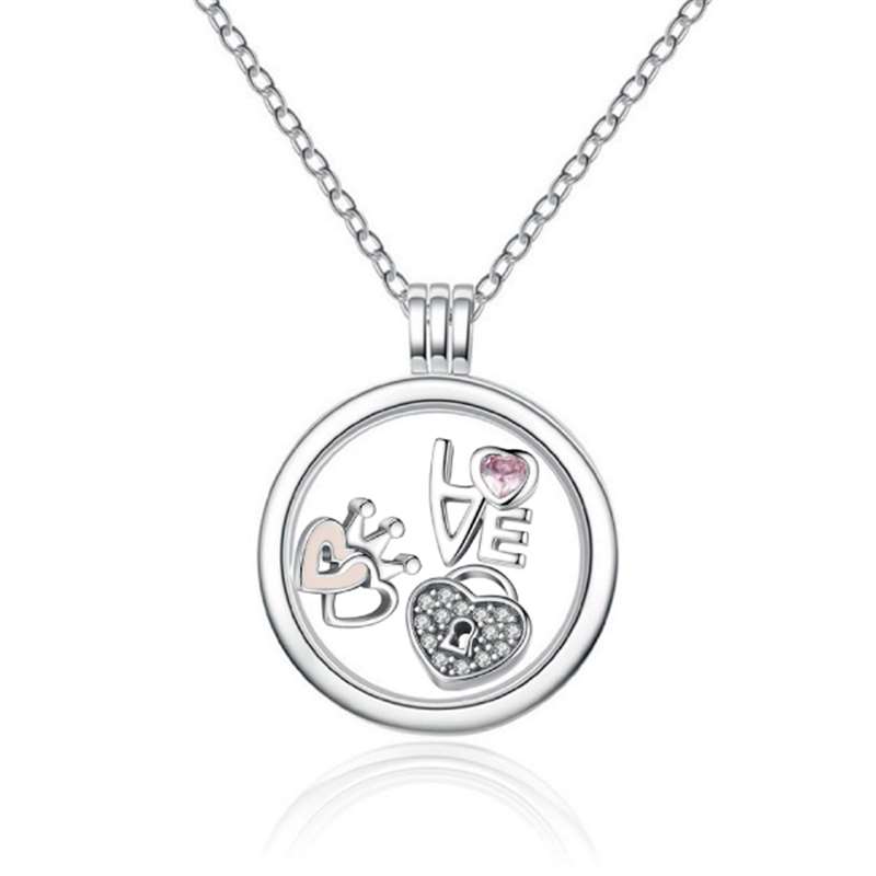 Collar relicario con pequeños dijes llave de corazón, corazones entrelazados princesa y LOVE. Todo fabricado en plata ley 925 y zircones swarovski