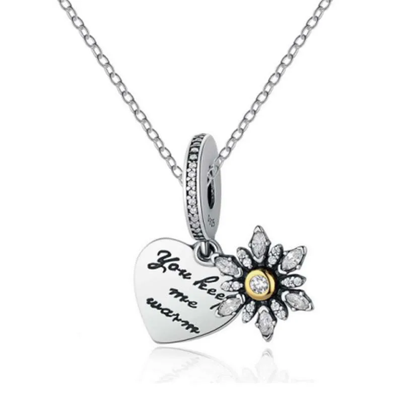 Collar en plata ley 925 lleva un dije en forma de corazón "ME MANTENGO CALIENTE EN TU CORAZÓN" acompañado de una flor con zircones swarovski color natural