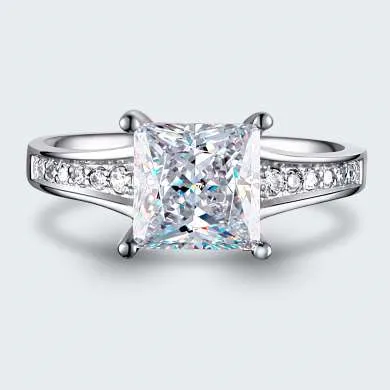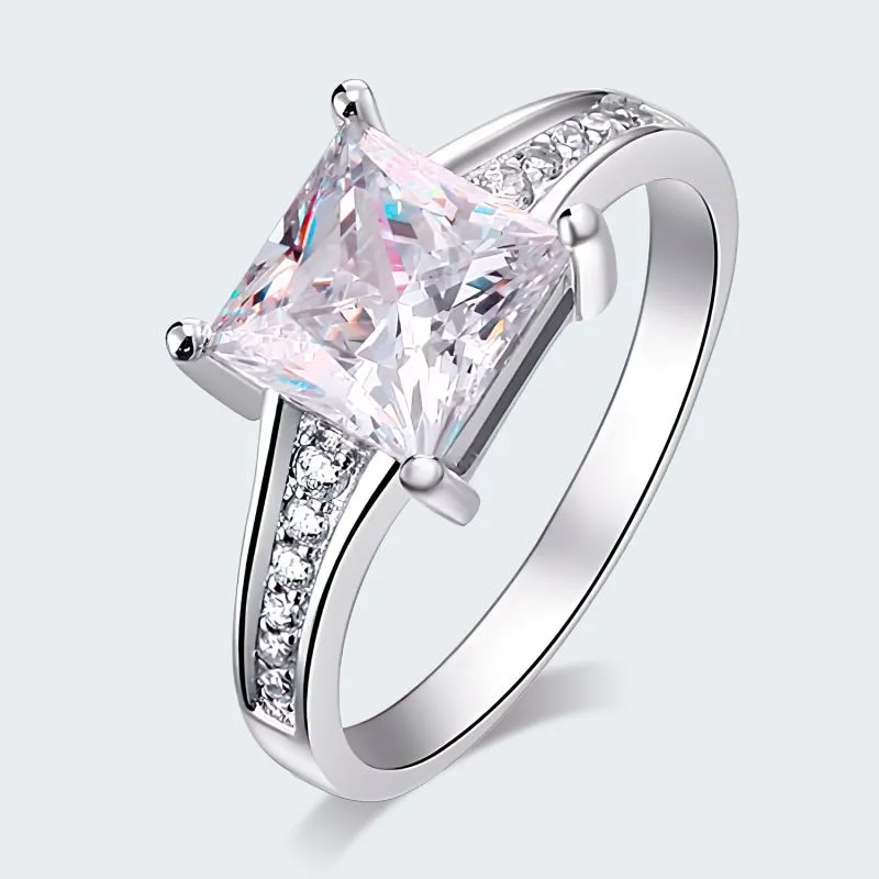Sortija en plata ley 925 con zircon swarovski calidad AAA, corte princesa además incrustaciones de zircones a cada lado