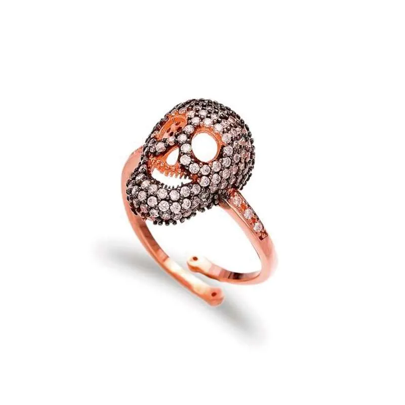 Plata ley 925 con acabado oro color rosa, lleva una calabera con detalles incrustados con zircones swarovski color natural