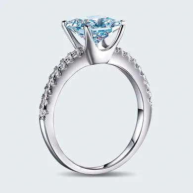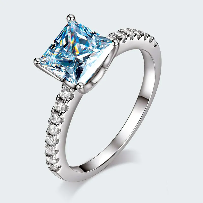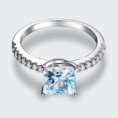 Sortija hecha en plata ley 925, lleva pequeñas incrustaciones en el aro y una piedra central corte princesa de zircón calidad AAA