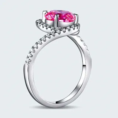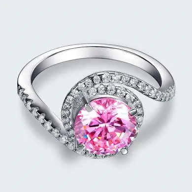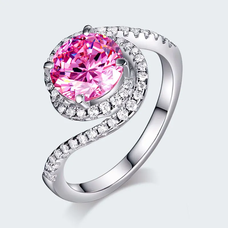 Sortija de compromiso en plata ley 925, lleva pequeñas incrustaciones de zircón en el aro y lleva una piedra central corte redondo color rosa
