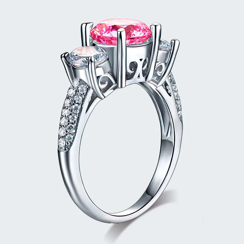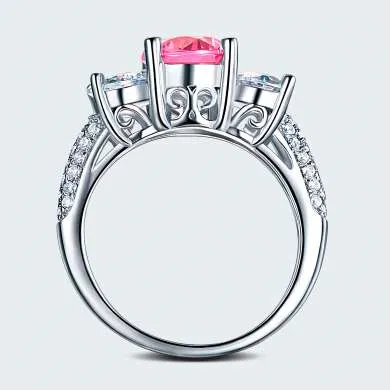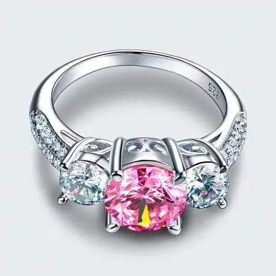 Plata ley 925 con zircones swarovski claridad AAA, lleva incrustaciones en el aro además dos piedras laterales corte redondo y una piedra central color rosa