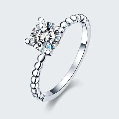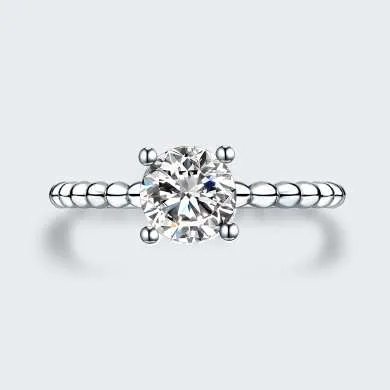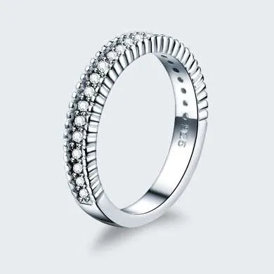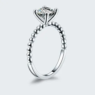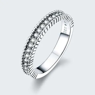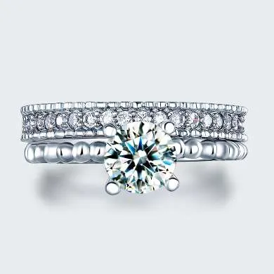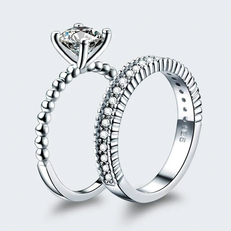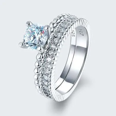 Dúo de sortijas en plata ley 925. El aro lleva pequeñas incrustaciones y la sortija principal lleva un zircon swarovski calidad AAA corte redondo, color natural