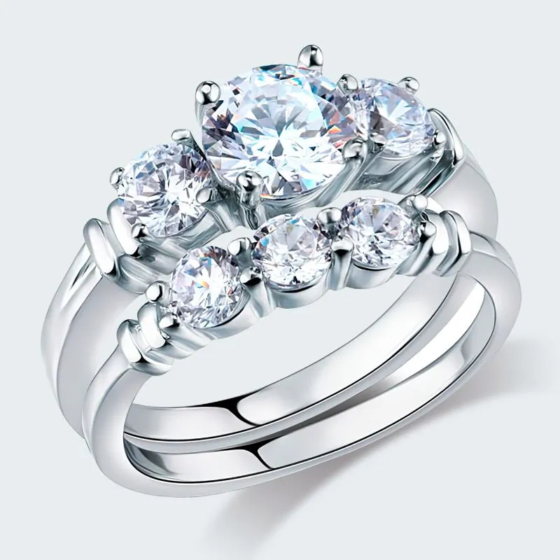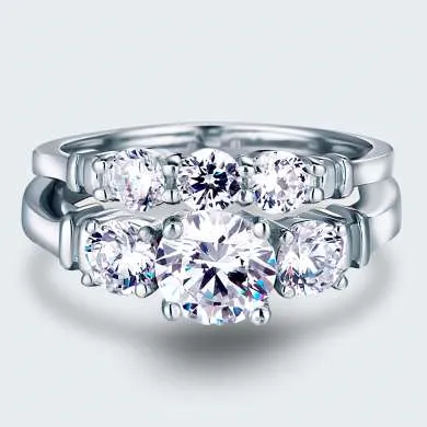 Dúo de sortijas en plata ley 925 con zircon swarovski calidad AAA, la primera sortija compuesto por tres zircones corte redondo y la segunda con una piedra principal