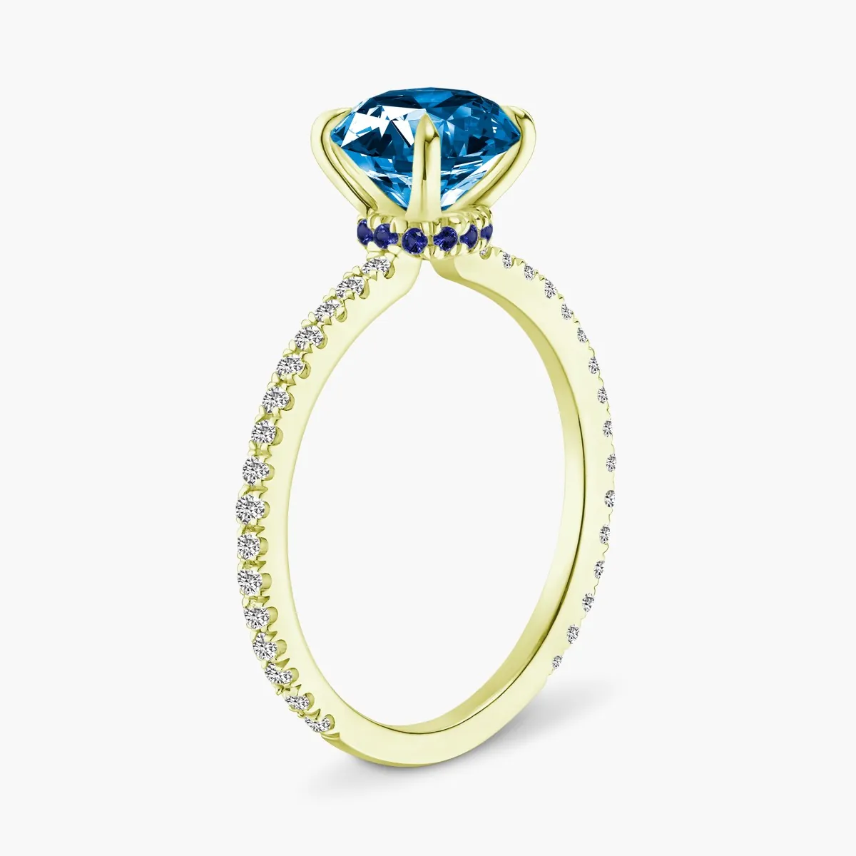 Oro amarillo con Topacio azul, Diamantes naturales y Zafiros azules