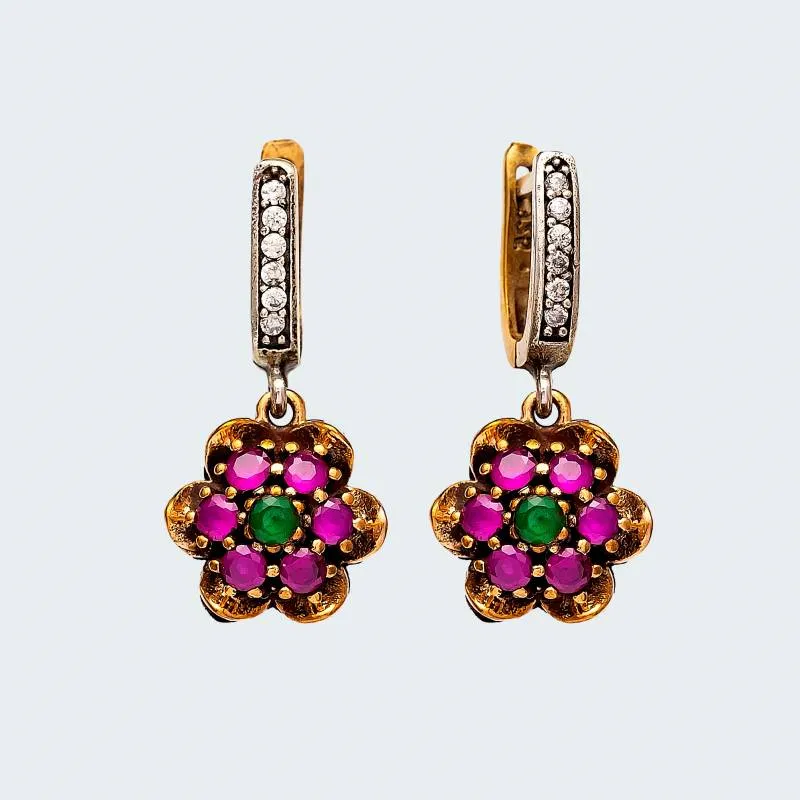 Aretes hecho con plata ley 925 enchapado en oro amarillo, lleva incrustaciones de zircones swarovski en diversos colores