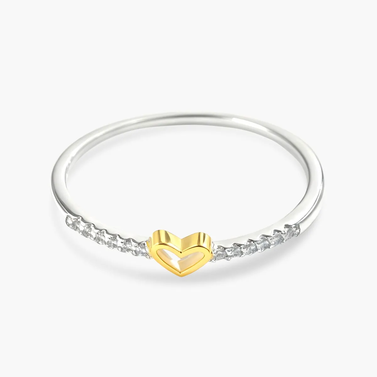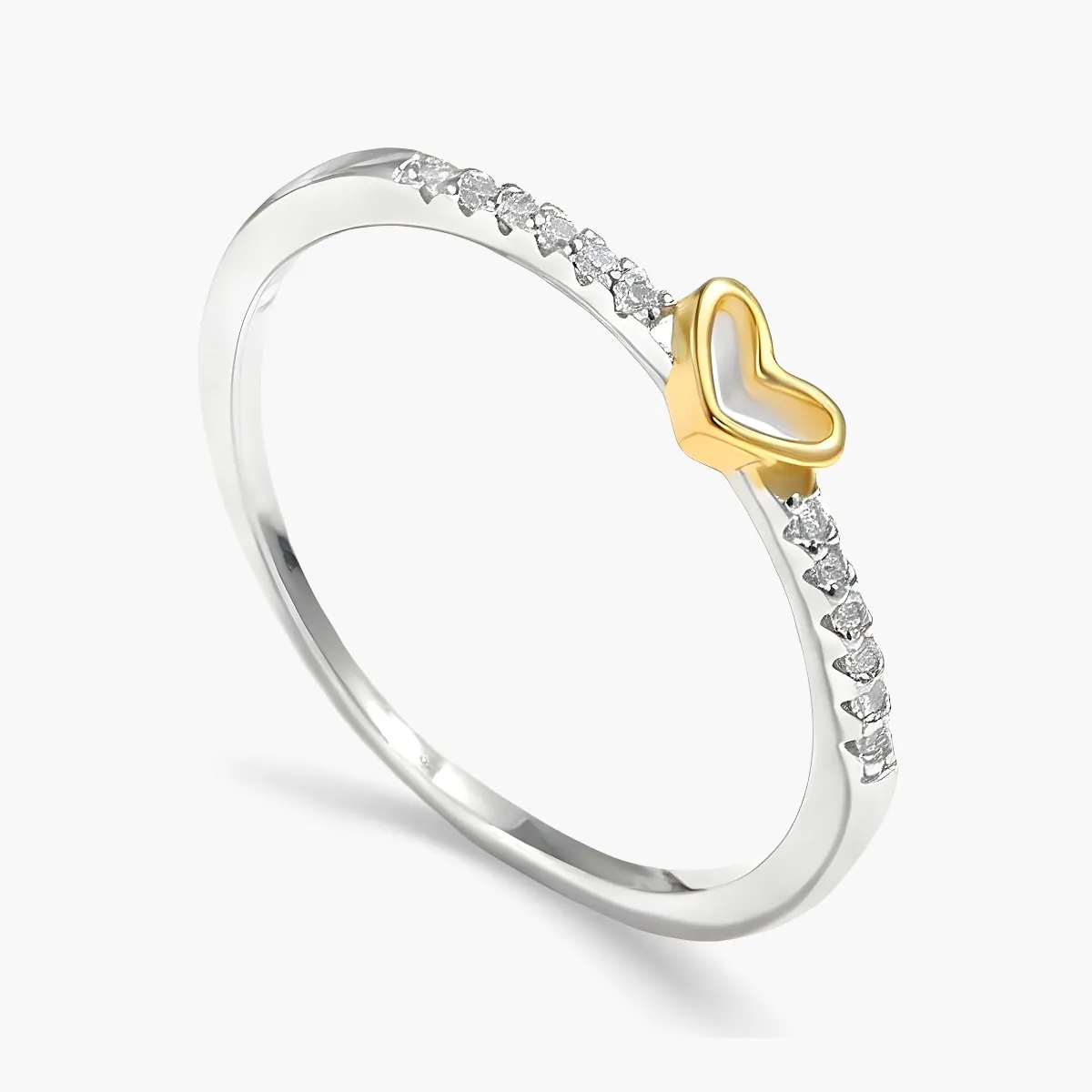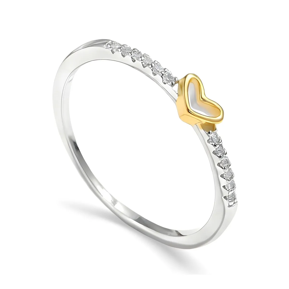 Aro elaborado en plata ley 925 con baño de rodio y acabado pulido. Su diseño destaca un corazón tallado, bañado en oro de 18K, que se convierte en el punto central de la pieza. Alrededor del aro se disponen 12 pequeñas incrustaciones de zircones calidad AAA, en corte redondo y engaste tipo pavé