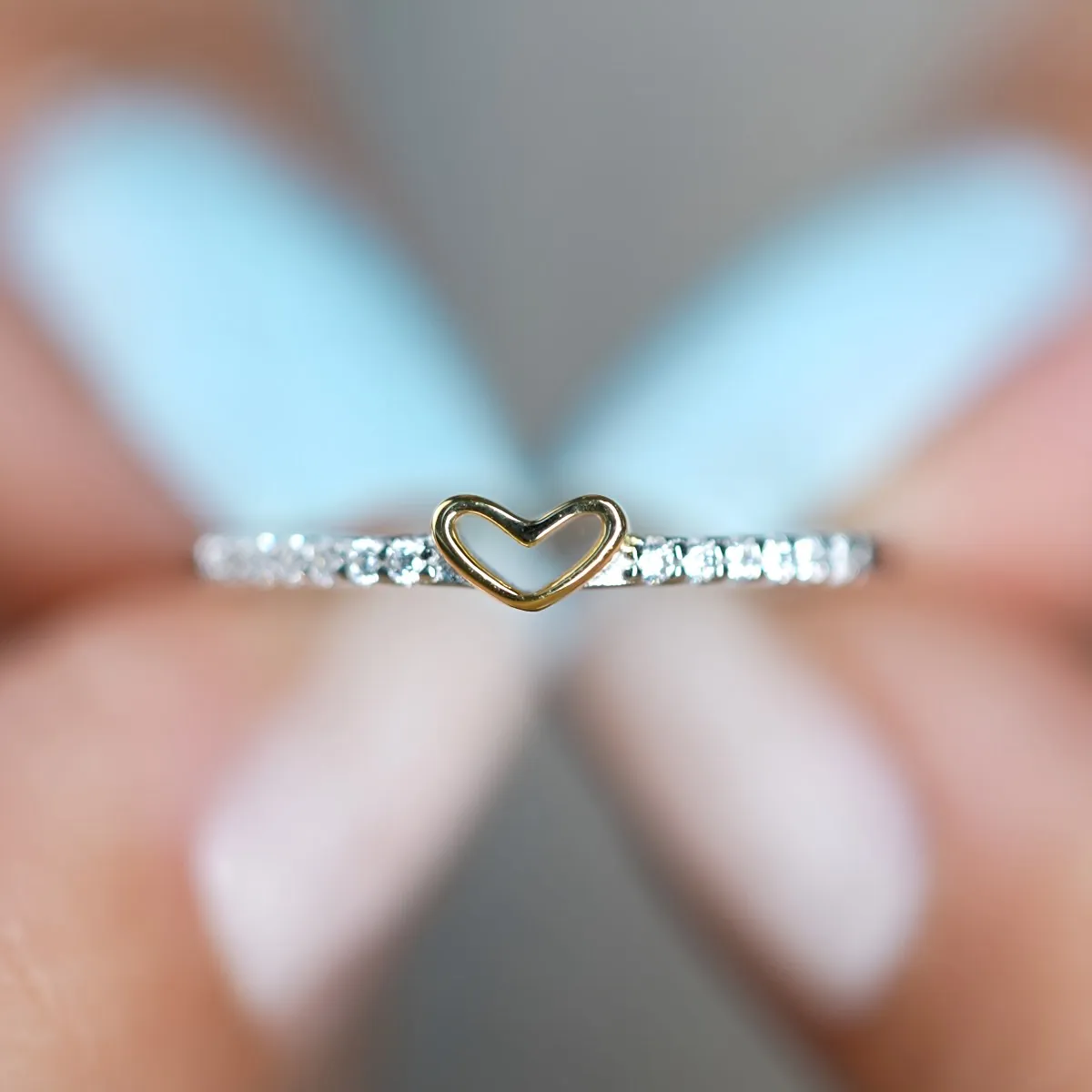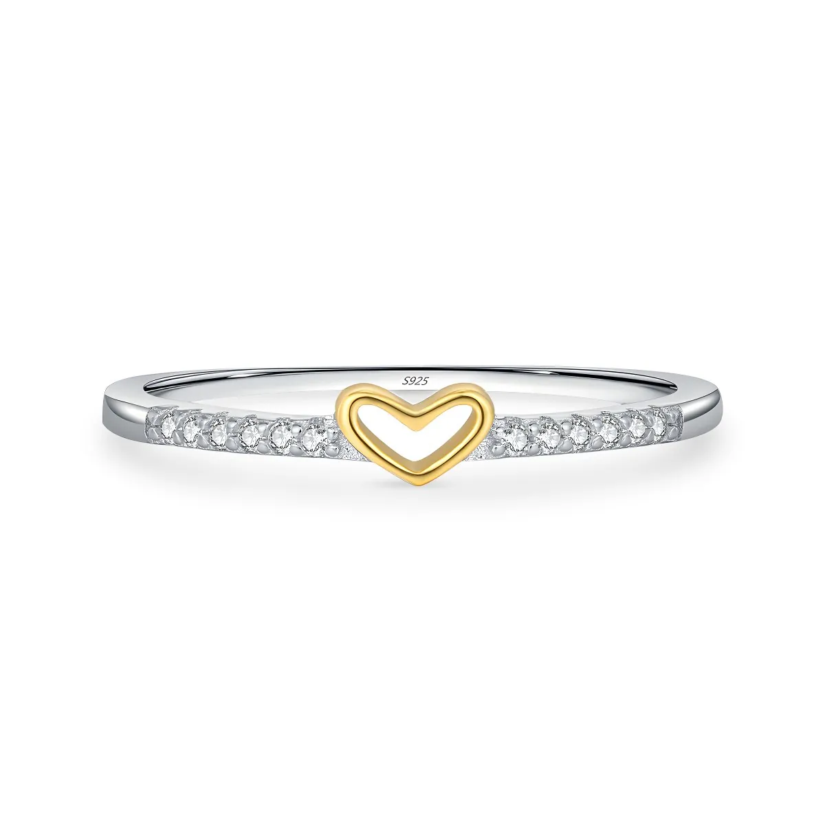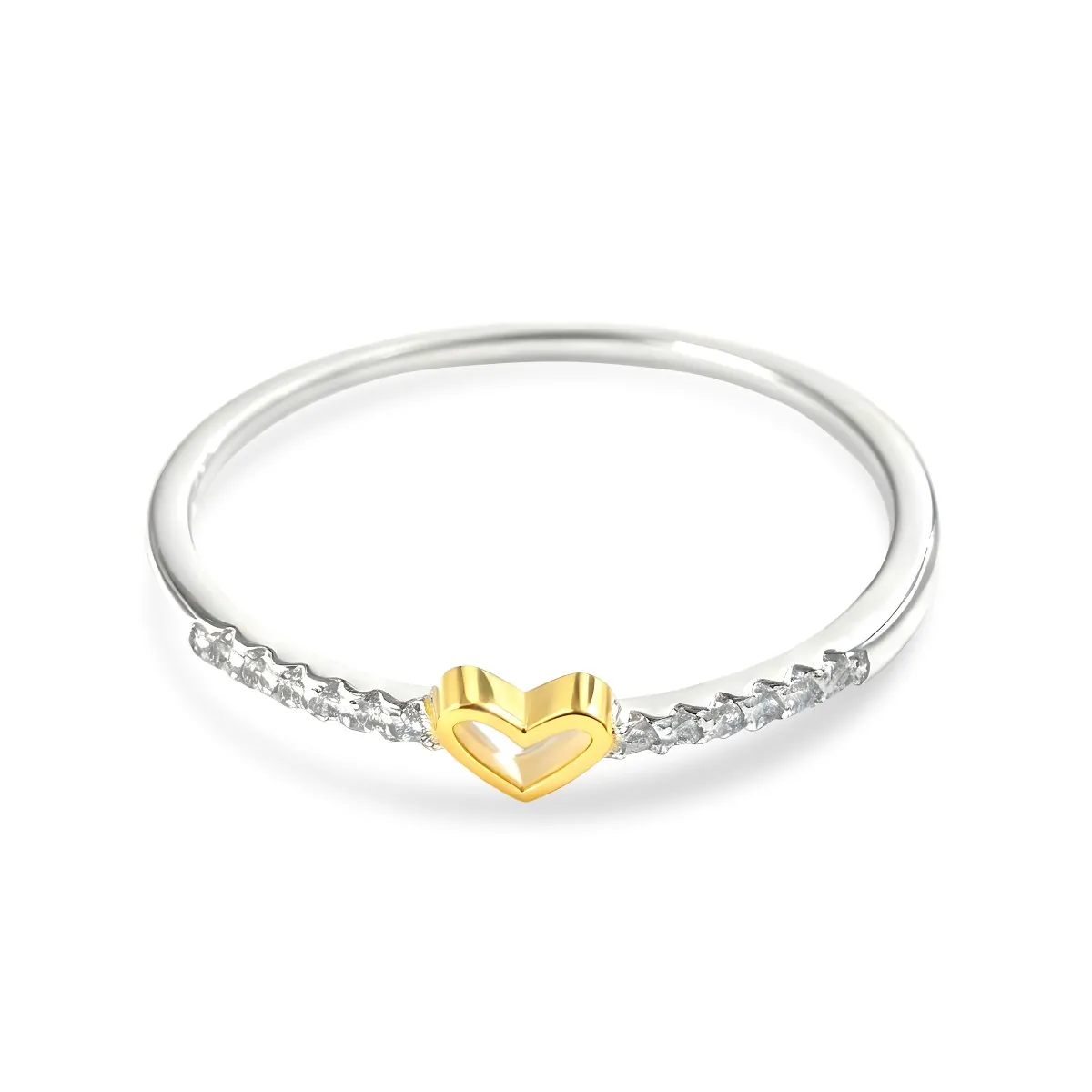 Aro elaborado en plata ley 925 con baño de rodio y acabado pulido. Su diseño destaca un corazón tallado, bañado en oro de 18K, que se convierte en el punto central de la pieza. Alrededor del aro se disponen 12 pequeñas incrustaciones de zircones calidad AAA, en corte redondo y engaste tipo pavé