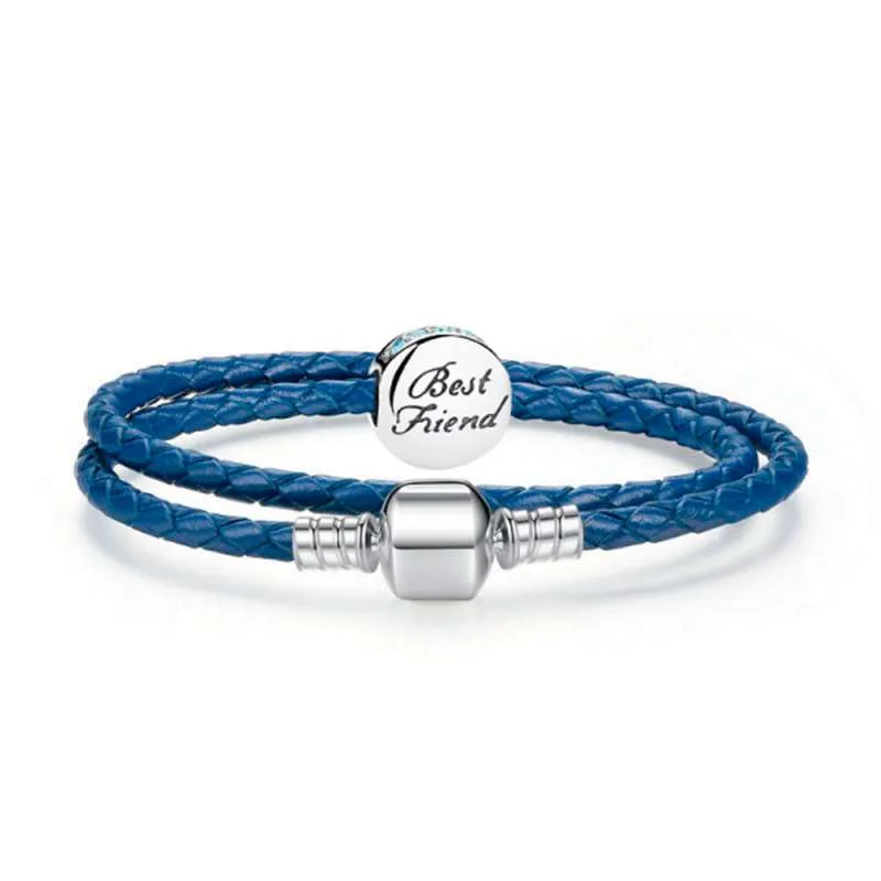 Pulsera con doble cuero color azul, lleva un pequeño dije donde lleva inscrito la palabra "Best Friends"