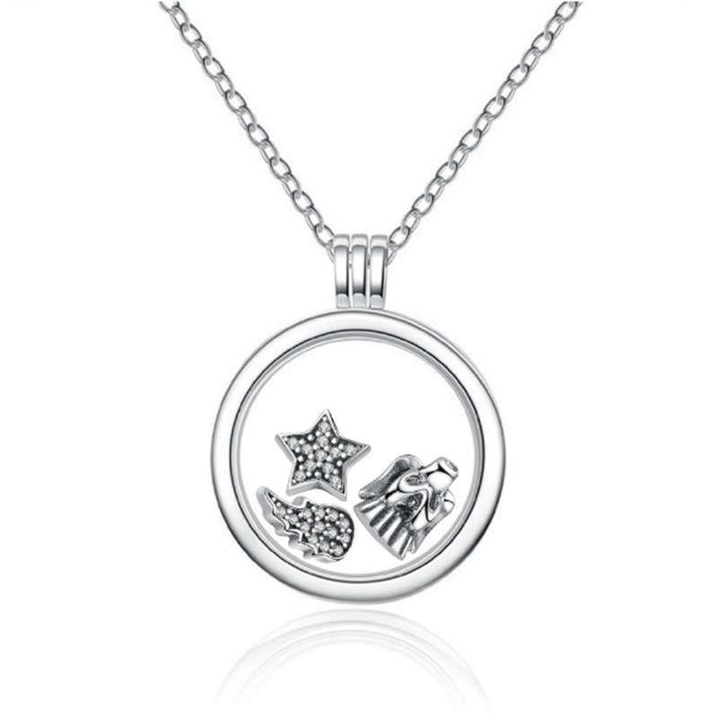 Collar relicario que lleva pequeños dijes estrella, alas y angelito. Todo fabricado en plata ley 925 y zircones swarovski