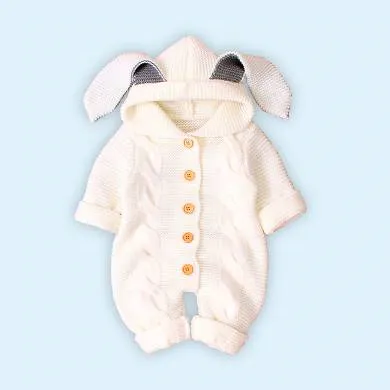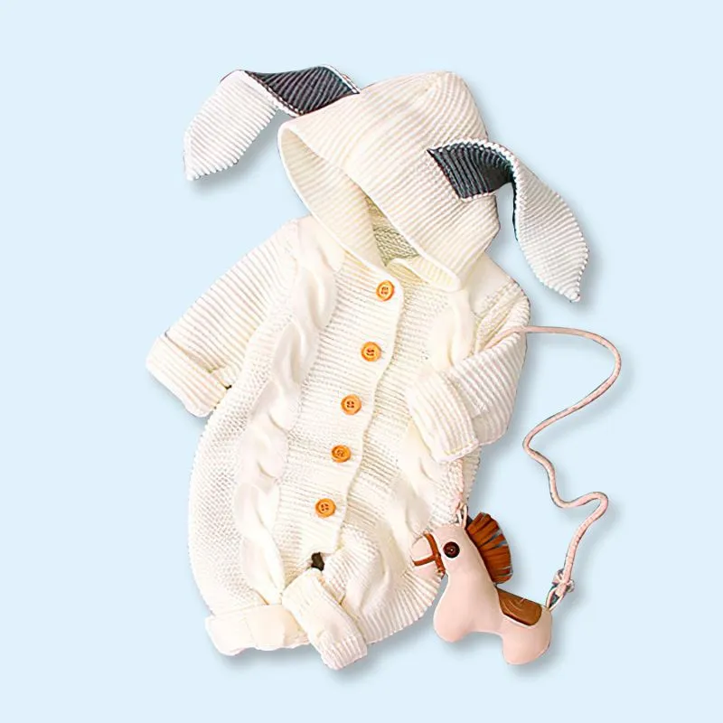 Enterizo de bebé fabricado con hilo de algodón, cuello tipo camisero, manga larga, botones de madera, con capucha y orejas tipo conejo.