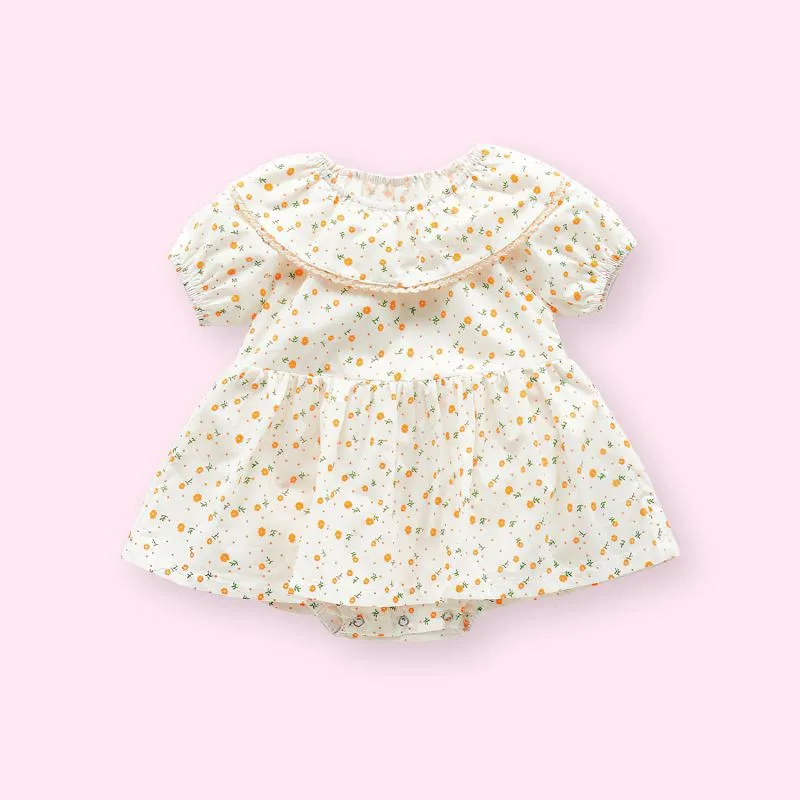 Vestido de bebé fabricado en algodón, cuello tipo Bertha, manga corta.